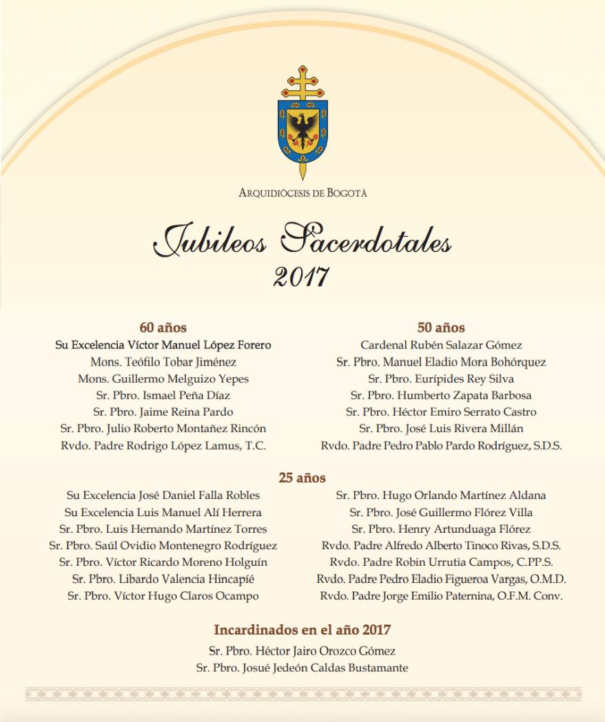 Centro de información Yo quiero Noticias Boletines Eventos Artículos Canonización Mensajes del Señor Cardenal Cartas pastorales Homilías Mensajes La voz del pastor Documentos del Vaticano NoticiasIglesia arquidiocesana celebra los jubileos sacerdotales12 de Octubre de 2017 Son 30 sacerdotes quienes celebran sus bodas de diamante, oro y plata. Toda una vida sacerdotal al servicio de Dios y la comunidad. Entre ellos se encuentran: el señor… Like 0 Dislike 0 Noticias relacionadas En la Catedral Primada Destacado El Catolicismo Mensaje: Monseñor Alejandro Díaz García
