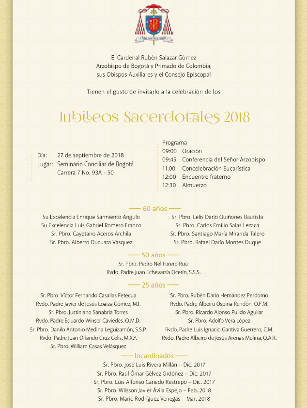 Centro de información Yo quiero Noticias Boletines Eventos Artículos Canonización Mensajes del Señor Cardenal Cartas pastorales Homilías Mensajes La voz del pastor Documentos del Vaticano NoticiasJubileos Sacerdotales 201825 de Septiembre de 2018 Like 0 Dislike 0 Noticias relacionadas Proyecto educativo del SEAB #Recomendado En la Catedral Primada