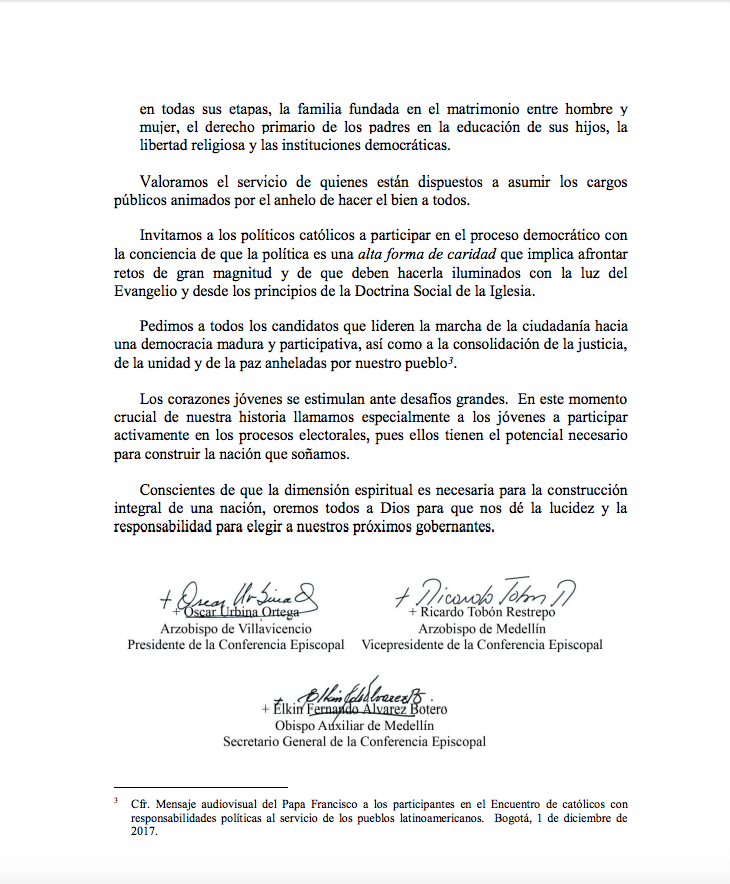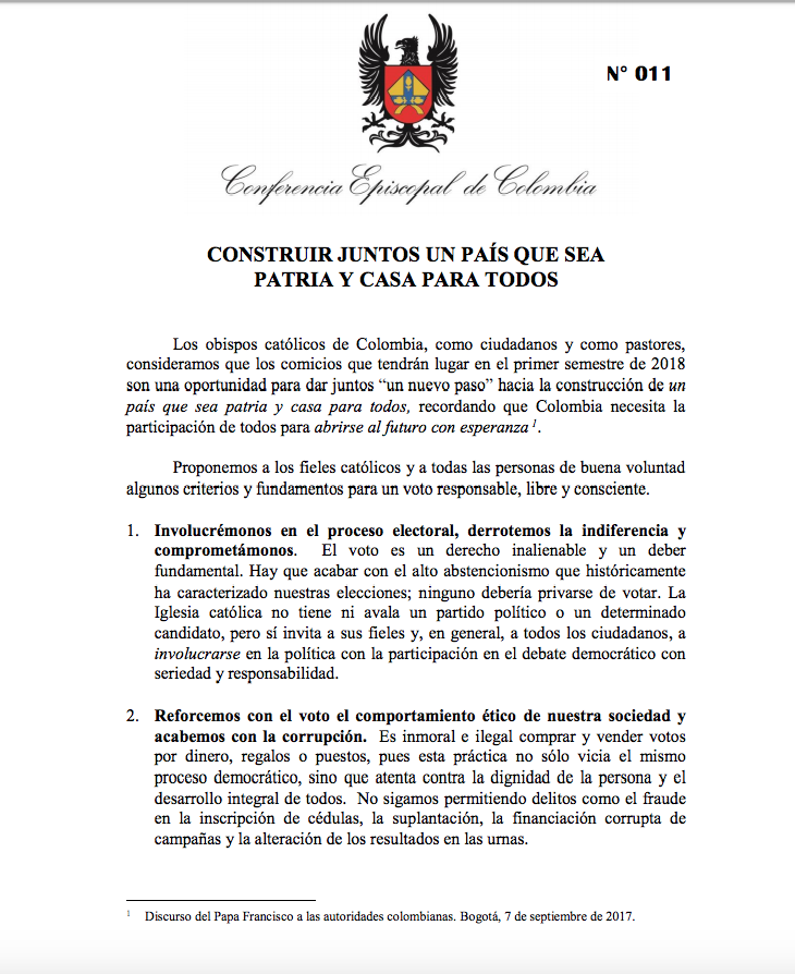 Centro de información Yo quiero Noticias Boletines Eventos Artículos Canonización Mensajes del Señor Cardenal Cartas pastorales Homilías Mensajes La voz del pastor Documentos del Vaticano NoticiasVotemos a conciencia y con responsabilidad15 de Junio de 2018Los obispos católicos de Colombia recuerdan a todos los fieles que, como ciudadanos y como cristianos, debemos votar consciente, libre y responsablemente Like 0 Dislike 0 Noticias relacionadas Proyecto educativo del SEAB #Recomendado En la Catedral Primada